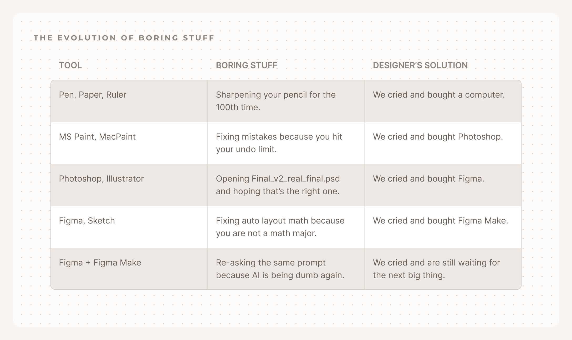 Throughout the design tools history, we are basically just letting our tools do more boring stuff. We use Photoshop instead of pen and paper so we don’t need to start from scratch when we make mistakes. We use Figma instead of Photoshop so we don’t need to manually recreate the same components on every page. We always move to a new tool when it can save us time. Now is that time again.