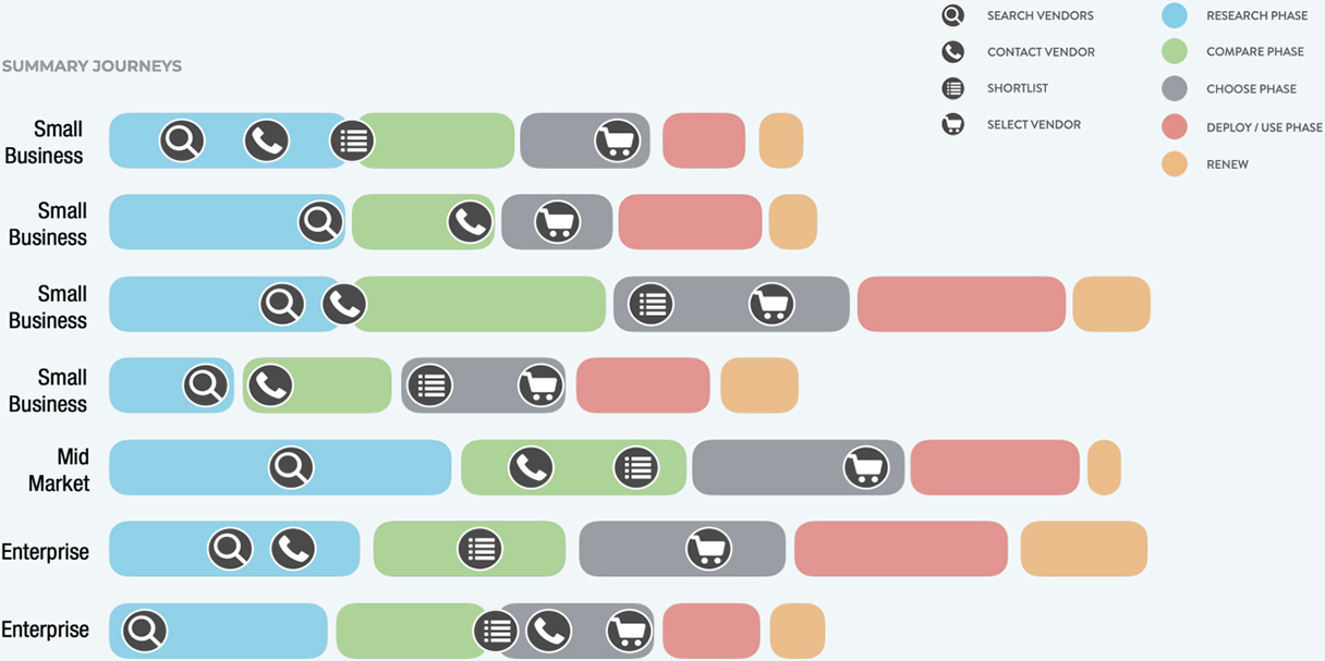 Persona segmentation considers parameters for grouping users types (for example Company Size or Project Type) in order to gain a more granular understanding of specific customer needs and the ability to accurately service them. The final segmentation serves as the foundation for key customer journeys to map. In this case, research identified 4 unique customer segment—each with a varying number of roles within the collaborative evaluation team.